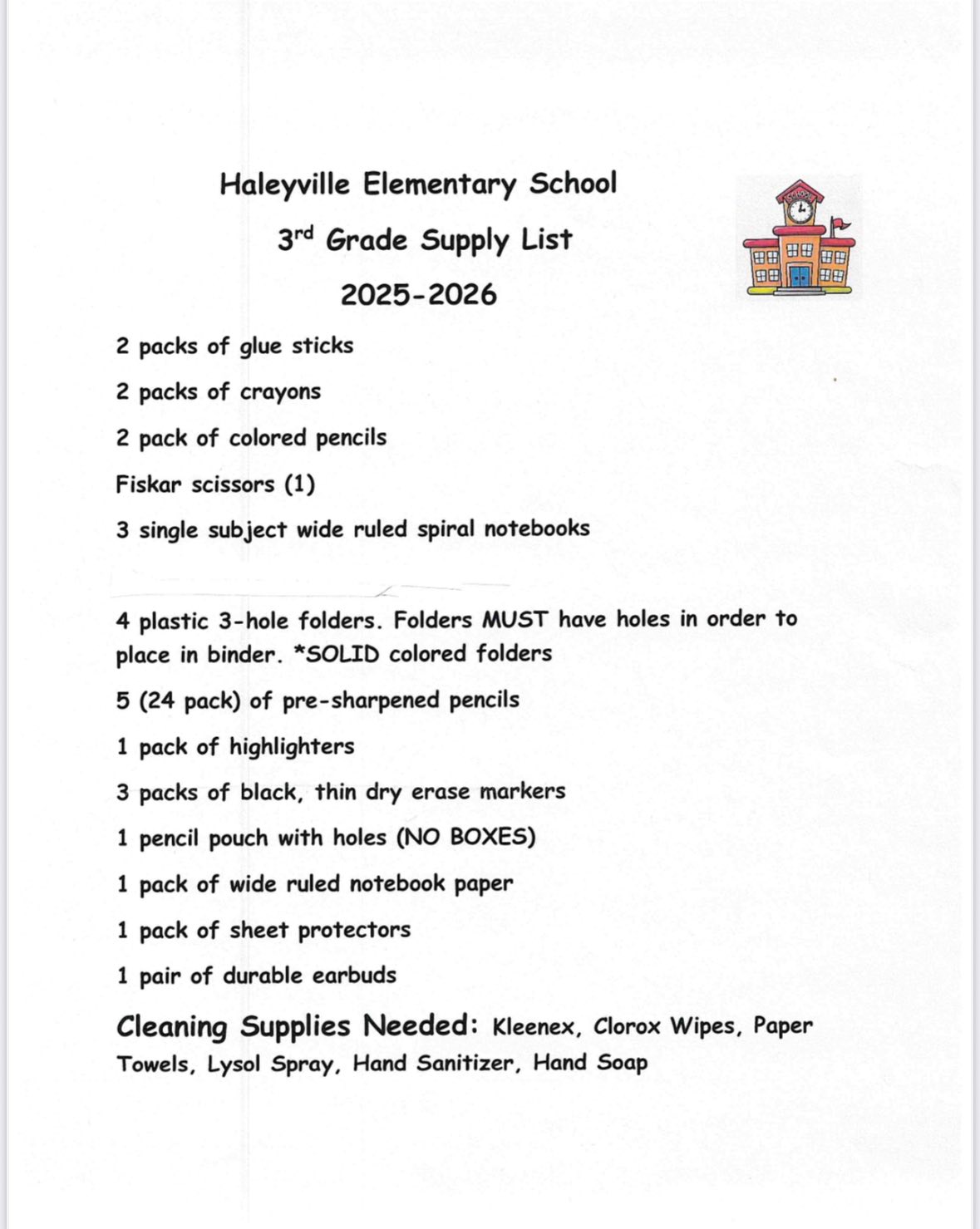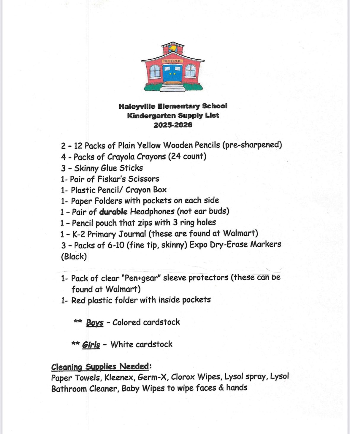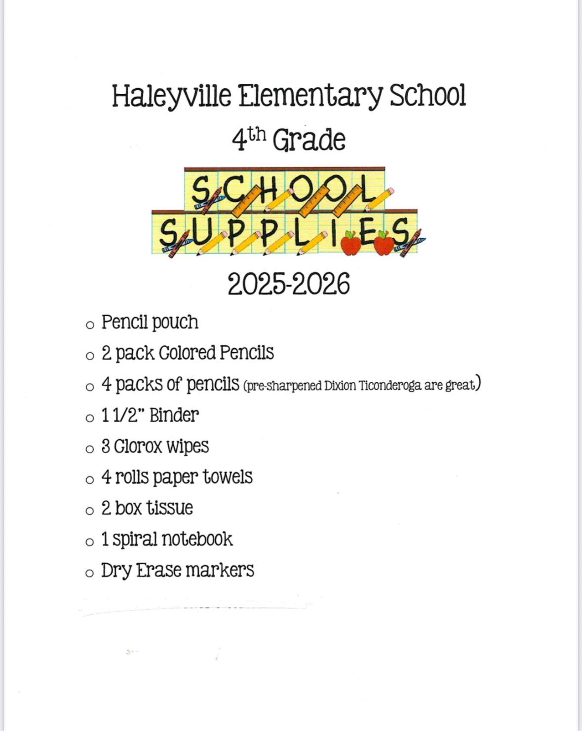 Haleyville Elementary School released their supplies lists this afternoon, outlining what each student needs prior to beginning the 2025-26 school year. The following lists have been created for kindergarten through 6th grades: